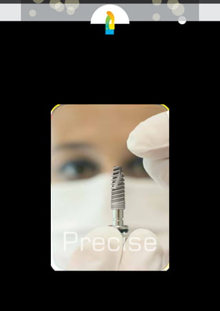 This document provides information about Precise Implant Systems Ltd., a dental implant manufacturer. It summarizes the company's profile, products, and key features. The company manufactures four types of implants - PSI Precise Spiral Implant, PST Precise Spiral Top, PSS Precise Spiral Standard, and PHI Precise Helical Implant. The implants are made of titanium alloy and feature a nano-mesh surface coating that promotes osseointegration. The document describes the features and intended benefits of each implant type. It also outlines the surgical drills, instruments, prosthetics and abutments available from the company.