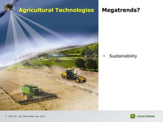 This document discusses trends in precision agriculture and smart machines. It outlines several megatrends driving technological development, including sustainability, automation and autonomous operation, reliability, electrification, and the internet of things. The guiding principle for new agricultural technologies is to achieve more production with fewer resources. John Deere is developing smart systems for tasks like crop management that use automation, sensors, and data analysis. There is a shift toward more electrically powered and electronically controlled machines that can use renewable energy sources. The future involves networked, adaptive farm management systems that optimize operations using cloud-based services and data from both on-farm and off-farm sensors. The goal is intuitive, reliable systems that help address grand challenges in food security and the environment