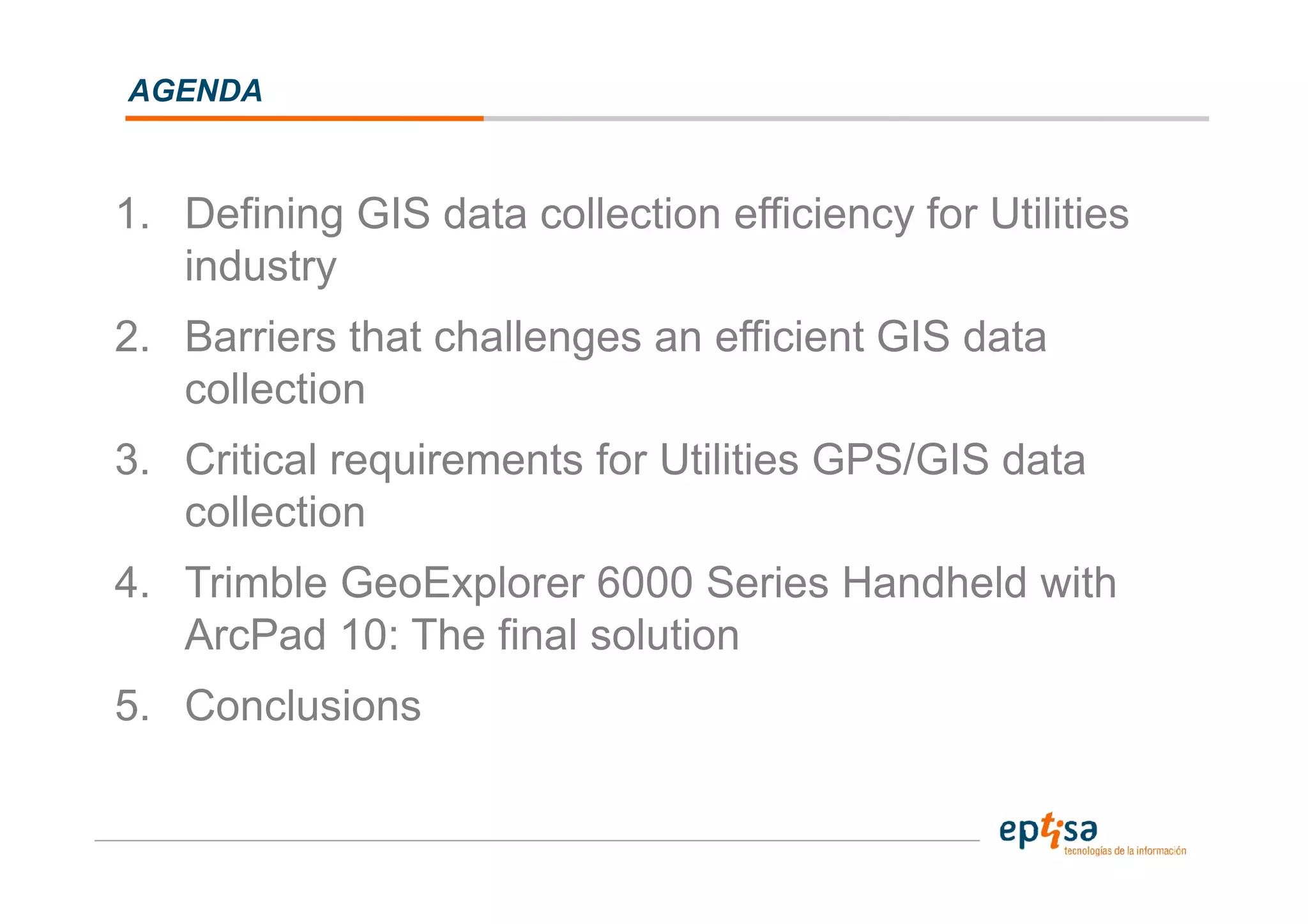 The document discusses GPS and GIS data collection solutions for utilities companies. It introduces the Trimble GeoExplorer 6000 series handheld which provides precise GPS positioning even in obstructed environments through features like Floodlight technology. The handheld is optimized for outdoor use with a rugged design, long battery life and sunlight readable display. It allows efficient data collection through integrated connectivity, computing power to run ArcPad 10, and a digital camera to link photos to mapped features. The solution aims to improve productivity by enabling accurate data capture in challenging conditions with minimal effort.