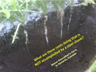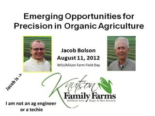 Precision Organics discusses opportunities for improving efficiency and effectiveness of field operations through precision agriculture techniques. Some larger organic grain farmers are using precision technologies like RTK guidance. Attention to detail is key to success for organic farmers. Precision techniques like controlled traffic, strip intercropping, and precision planting of cover crops can help organic farmers improve yields and reduce costs.