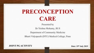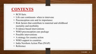 The document presents an overview of preconception care, emphasizing its significance in improving maternal and child health outcomes by addressing various risk factors through evidence-based interventions. Key components include nutrition, tobacco use, genetic conditions, environmental health, and mental health support. It also outlines the importance of national strategies and support from organizations like WHO to achieve maternal and child health goals in alignment with global health targets.