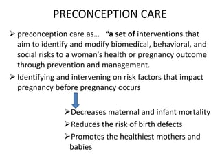 Preconception care involves identifying and addressing biomedical, behavioral, and social risks to a woman's health or future pregnancy outcomes before she becomes pregnant. It is important because many birth defects and problems develop very early in pregnancy, before most women even know they are pregnant. Key components of preconception care include screening for nutritional deficiencies, infectious diseases, genetic risks, lifestyle factors like smoking, alcohol and drugs, and treating any issues identified. The goal is to promote the healthiest outcomes for both mother and baby.