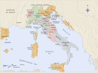International Gothic was a style of painting and sculpture in Europe from 1150-1450. This period saw a precursor to the Renaissance in Italy, with artists beginning to consciously revive classical styles and focus on humanism and naturalism in their works. Some key developments included Nicola Pisano's classical-inspired pulpits from the 13th century, Giotto's frescoes showing more realistic human emotion and form, and Duccio's large altarpieces which helped to establish panel painting as a major artistic medium in Italy.