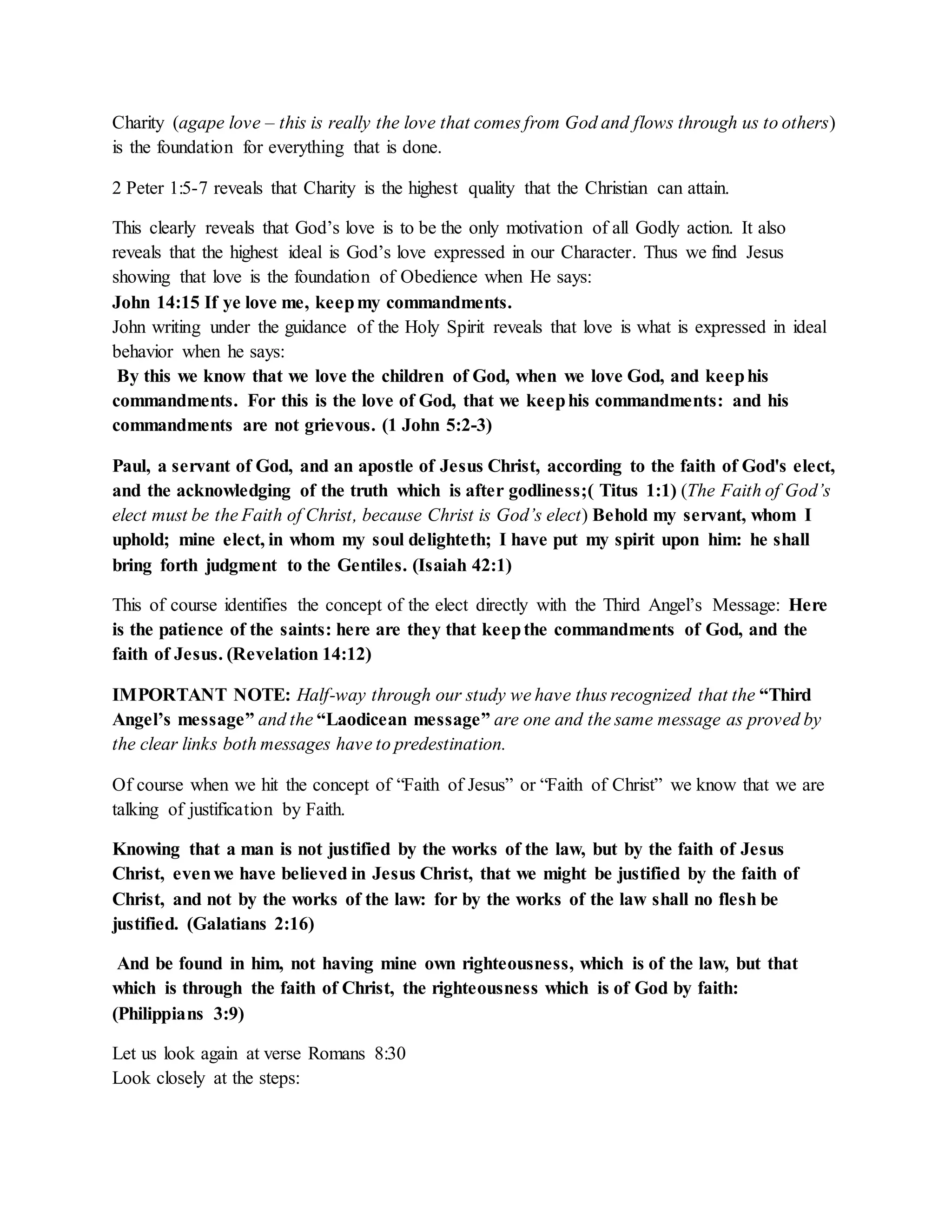 The document explores key biblical concepts of predestination, election, and the importance of charity in Christianity, highlighting verses from various scriptures to illustrate the relationship between God's foreknowledge, calling, justification, and glorification of the elect. It emphasizes that love, expressed through charity, is the foundation of Christian obedience and character, while also linking these themes to the teachings of Jesus and the apostles. The text concludes with reflections on the transformative nature of being born again and the call for believers to exemplify Christ's character and glorify God.