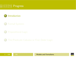 The document discusses models and formalisms in logic. It introduces formal systems as consisting of an axiomatic theory, symbols for constructing formulas, grammar rules, axioms, inference rules, and properties like consistency. Propositional and predicate logic are examined, including their model theories, axiomatic theories, properties like completeness and soundness, and resolution principles. Normal forms and the resolution rule are defined as ways to deduce theorems in a formal system.