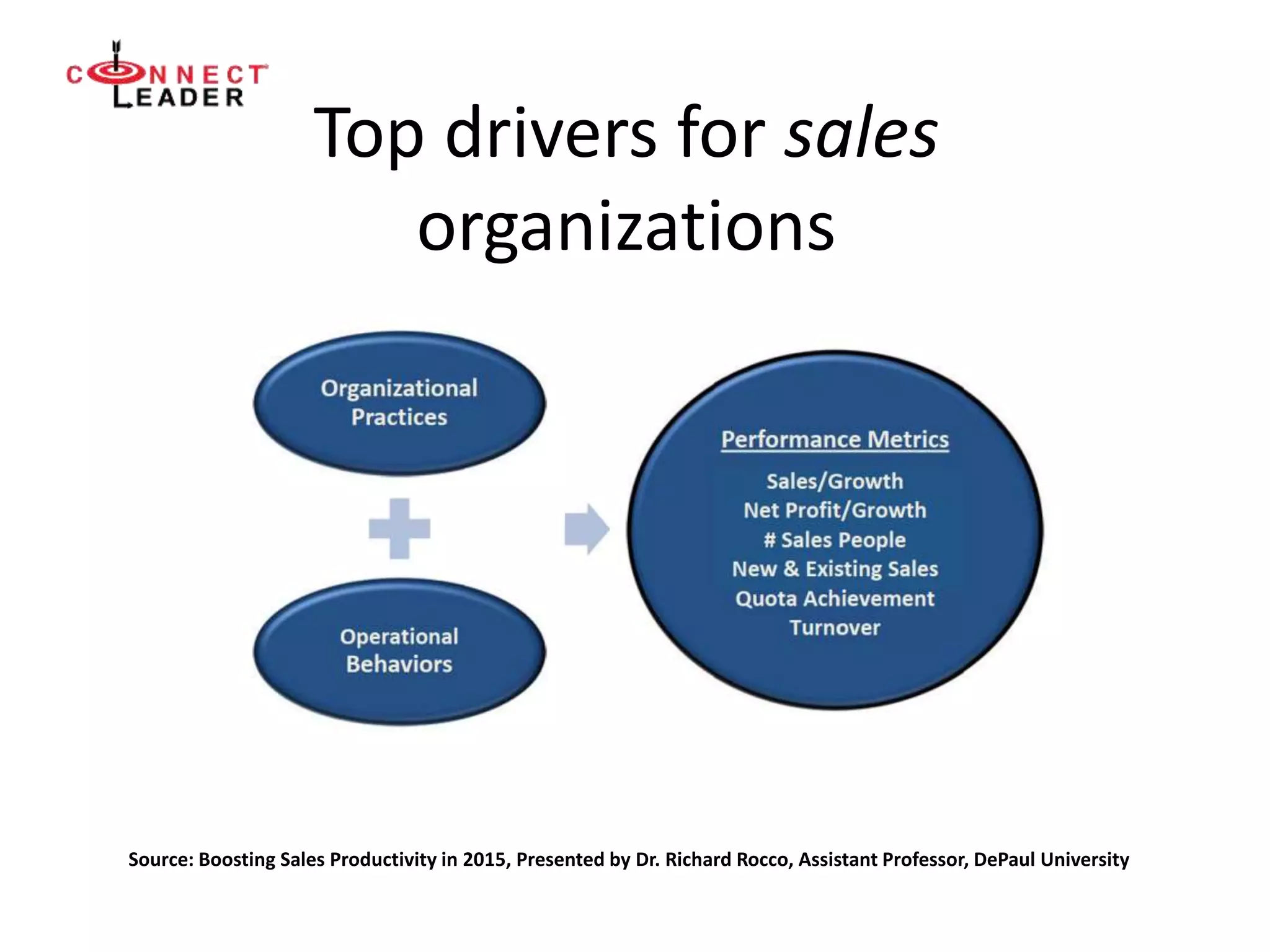 The document outlines key drivers for high growth inside sales organizations, including defining sales processes, building sales models, and managing teams for stability. It emphasizes the importance of CRM analytics and consistent coaching to enhance sales productivity and outlines the need for reliable sales forecasts. Additionally, it discusses risk factors, velocity, and conversion rates as critical components of an effective sales model to achieve predictable results.