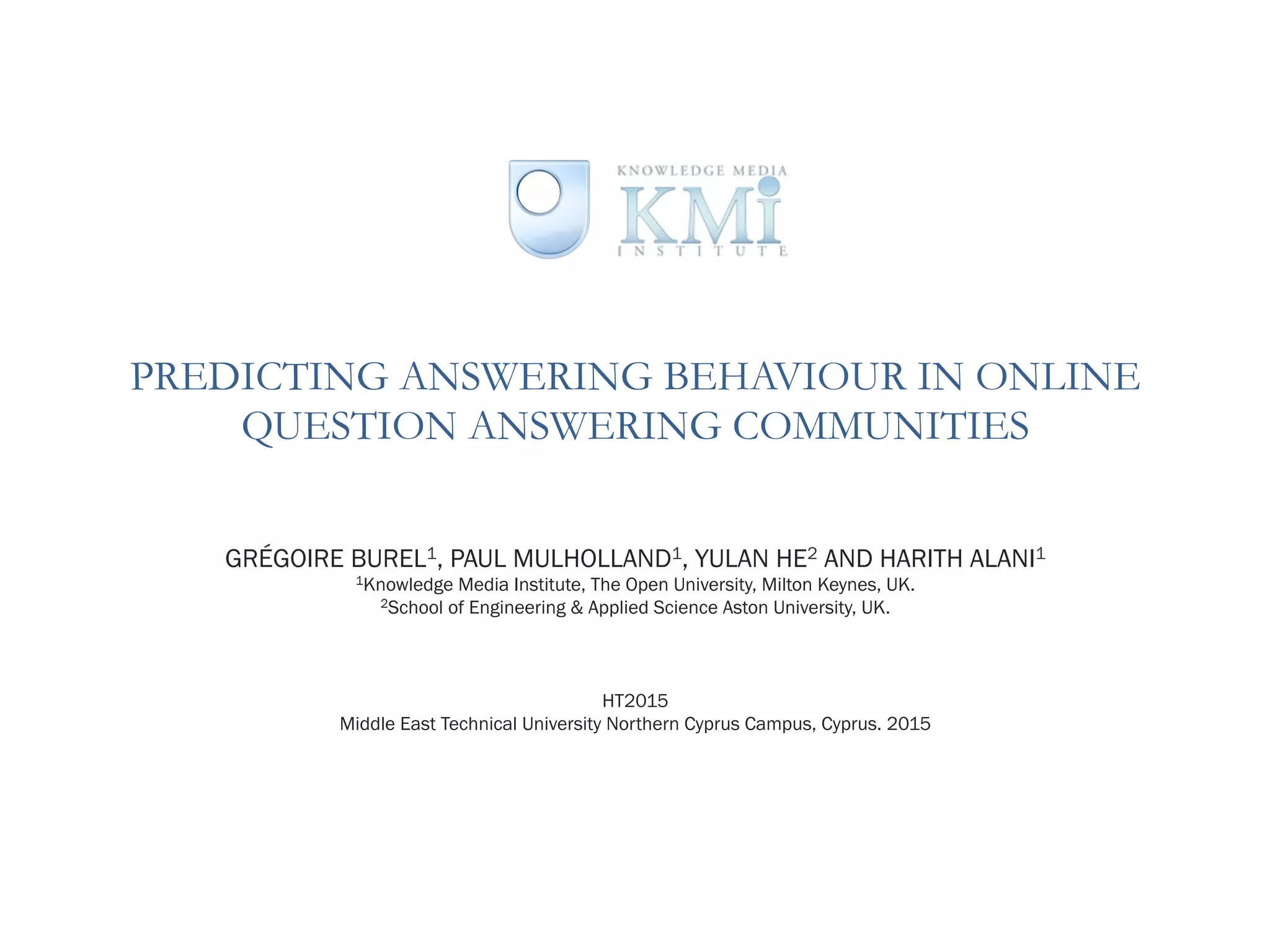 This document discusses predicting answering behavior in online question answering communities. It presents a method to represent individual users' question selection behavior using a matrix structure. It then uses learning to rank models to predict this behavior based on user, question, and thread features. The models achieved a mean reciprocal rank of 0.446, significantly outperforming baselines. Question features were found to be the most predictive, indicating questions from reputable users and with fewer existing answers are more likely to be selected.
