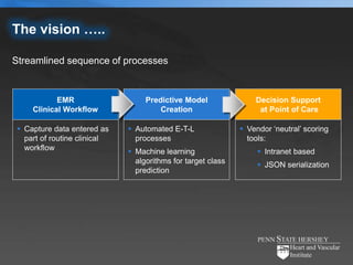 This document discusses using a TreeNet model to predict hospital readmissions using data from electronic medical records (EMRs). It provides an overview of the dataset used, which includes over 1,000 clinical and administrative variables for 1,612 heart failure patients. The document describes how TreeNet was used to create a predictive model from the EMR data, including feature selection and parameter tuning. It also discusses evaluating the model, assessing variable importance, and exploring model results to gain clinical insights. The goal is to develop an accurate model that can help reduce the risk of avoidable hospital readmissions.