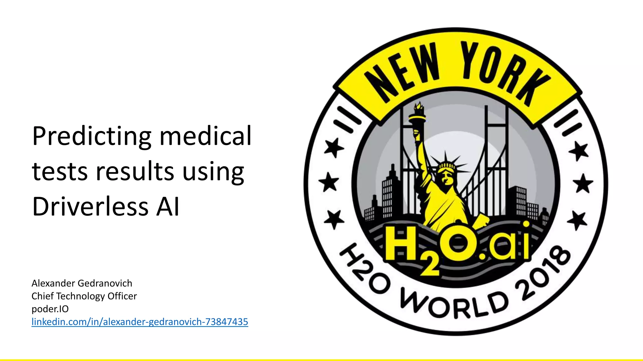 3. A joint team from poder.IO and Bayer developed models to predict individual medical test results using healthcare data, without direct lab measures. This could help improve treatment strategies. They used techniques like GLM, GBM, random forest and Driverless AI to develop and compare models for a medical test, finding Driver