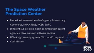 The document discusses how NOAA's Space Weather Prediction Center transitioned from a monolithic architecture to microservices using Docker. It describes how they started with a small verification project, then replaced their critical GOES satellite data source. This improved developers' morale and delivery speed. They encountered some security issues initially but learned from them. The transition was very successful and allowed them to quickly expand their mission to forecast aviation impacts using scientists' models packaged as Docker services.