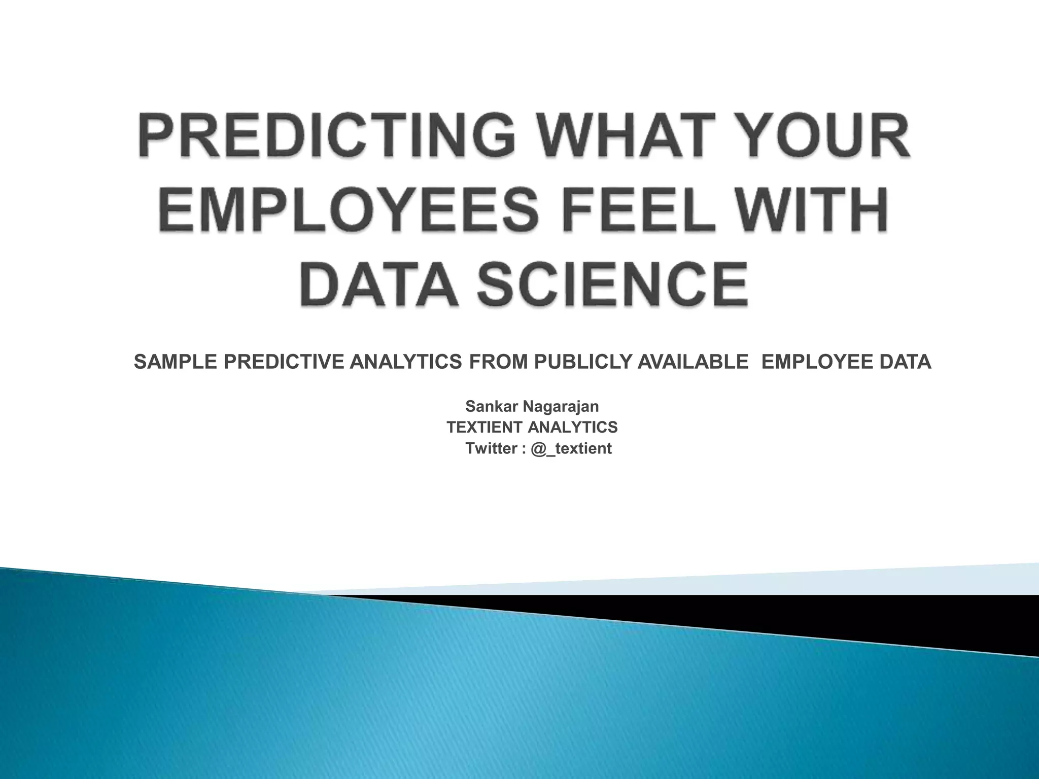 The document discusses predictive analytics derived from publicly available employee data, highlighting feelings of sadness among employees in a mid-sized IT services company. It identifies several contextual triggers for these feelings, their impact on employee perception, productivity, and overall organizational engagement, as well as a general desire for appreciation and flexibility within the workplace. The author emphasizes the need for organizations to adapt to employees' evolving needs to maintain engagement and drive innovation.