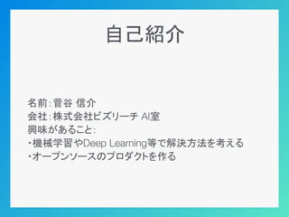 自己紹介 名前:菅谷 信介 会社:株式会社ビズリーチ AI室 興味があること: ・機械学習やDeep