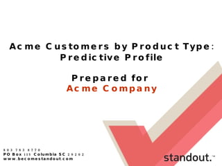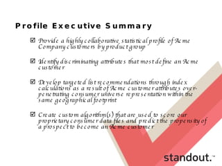 The document provides a statistical profile and cluster analysis of customers for Acme Company. It analyzes customers across various demographic variables like age, income, occupation, household type, and interests. Four key customer clusters are identified that differ in characteristics like income, education, and other attributes. The analysis aims to develop targeted marketing recommendations for Acme based on which customer segments are most likely to respond.