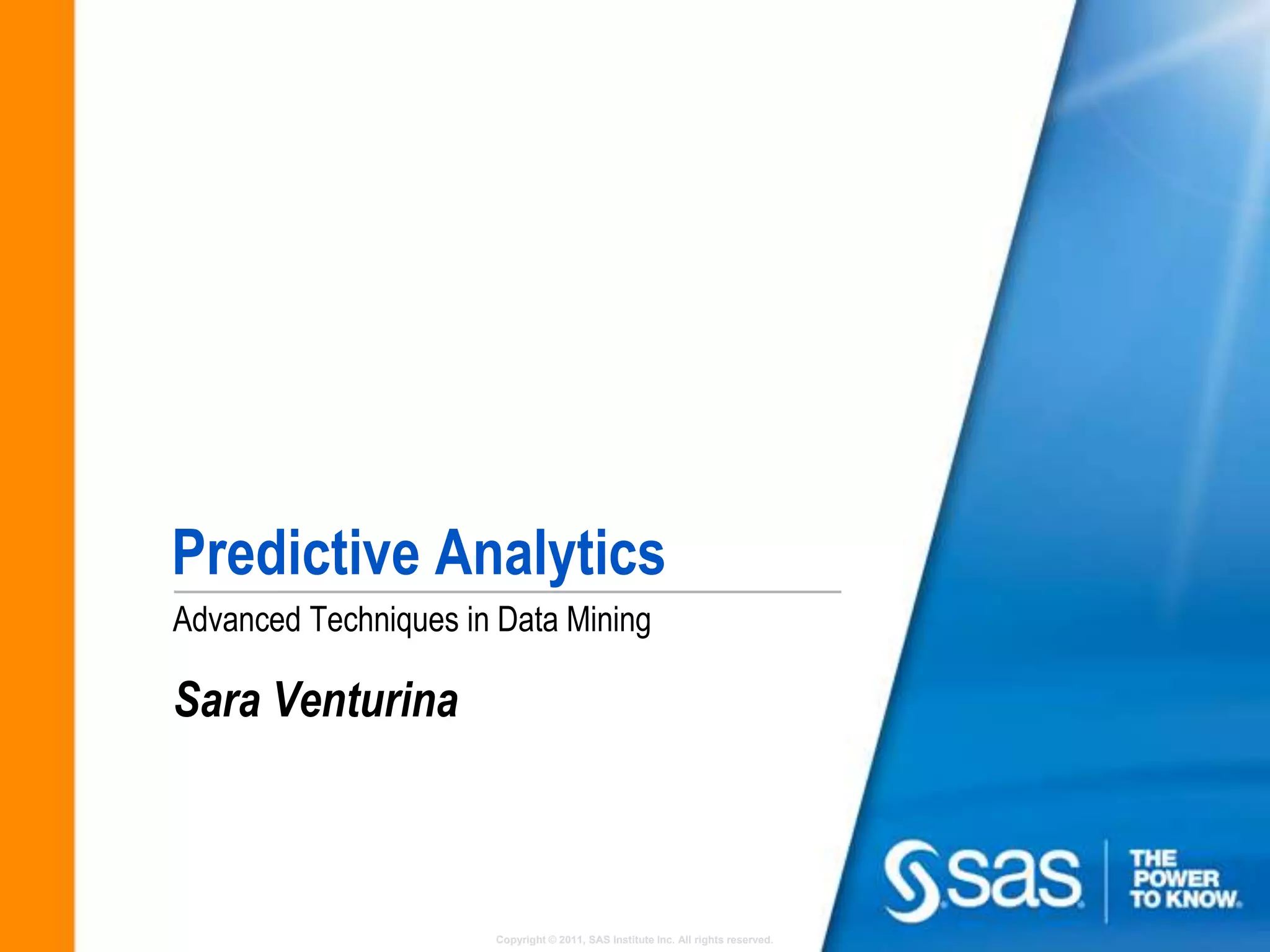 The document discusses predictive analytics techniques including data preparation, modeling, and model monitoring. It describes preparing data through transformation, deriving behavioral variables, and quality checks. Modeling techniques covered include decision trees, regression, neural networks, and ensemble modeling in SAS Enterprise Miner or other software. Model monitoring compares actual and predicted values, analyzes variable distributions in scored data, and monitors model performance metrics.