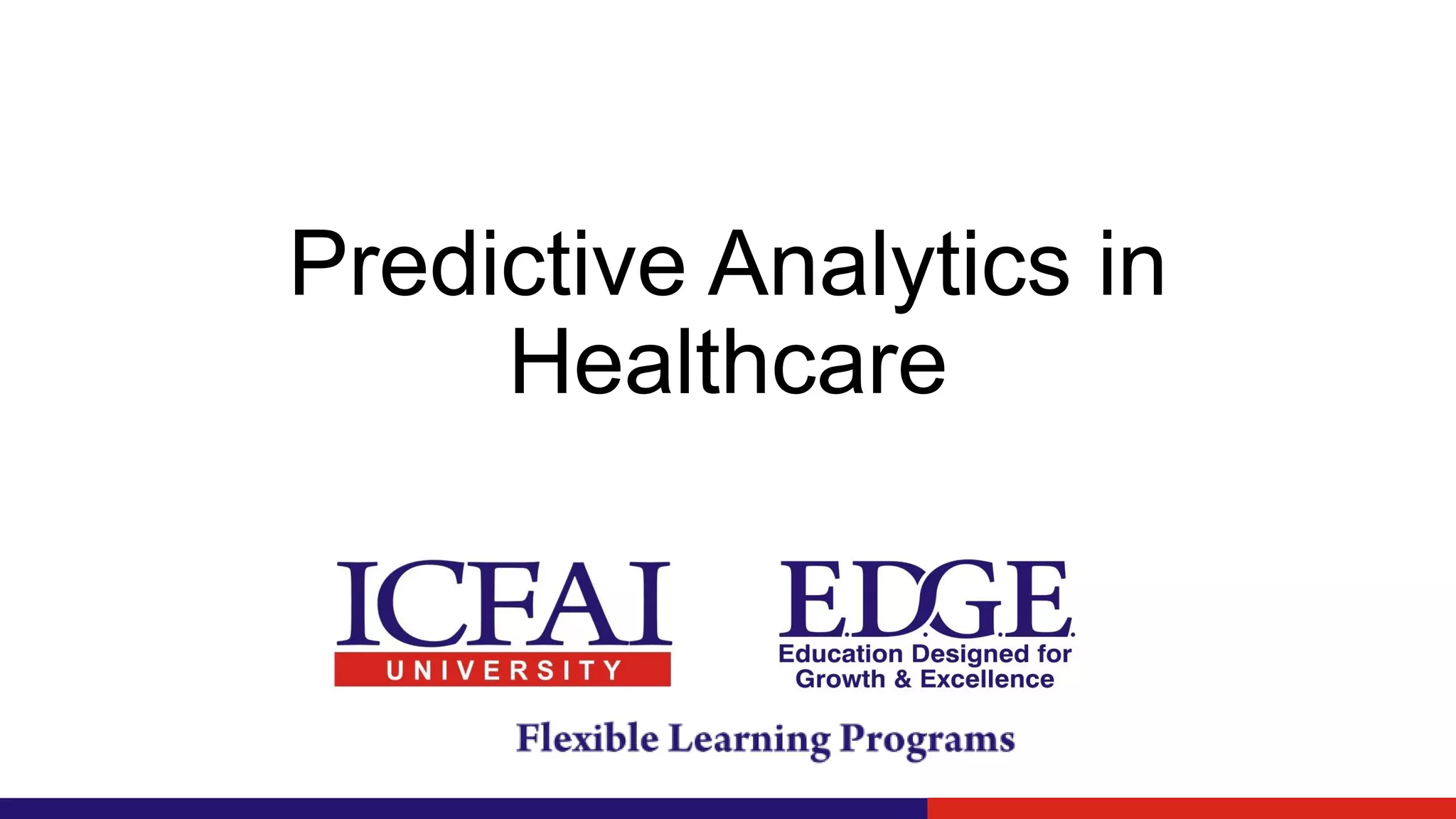 Predictive analytics in healthcare enhances patient outcomes by analyzing data to forecast events, allowing providers to take preventative actions. It differentiates from traditional statistics by focusing on individual predictions rather than group averages and relies heavily on data from past treatments and research. Additionally, Icfai offers flexible learning programs for working professionals in various fields such as finance and healthcare, enabling them to gain necessary skills while continuing their careers.