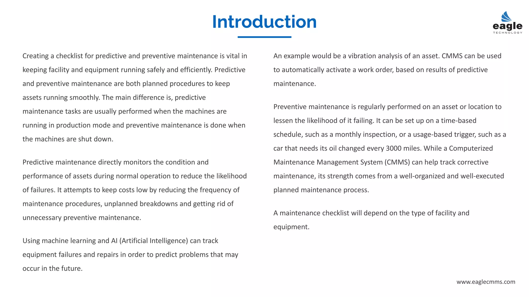 The document outlines the importance of creating a predictive and preventive maintenance checklist to ensure facility and equipment safety and efficiency. It highlights the differences between predictive maintenance, which monitors equipment during operation, and preventive maintenance, conducted during shutdowns, and discusses the use of technology like machine learning and CMMS. A detailed checklist is provided for safety inspections, equipment maintenance, and vehicles to enhance overall asset reliability.