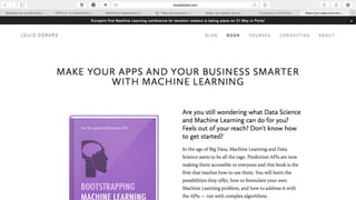 This document discusses predictive apps for startups using machine learning. It provides examples of everyday use cases like real estate price prediction and email spam detection. It explains that machine learning works by training a model on data and then using the model to make predictions on new data. The document also discusses how to make machine learning more accessible through cloud platforms and APIs, and how automation tools can help simplify machine learning tasks like model tuning and algorithm selection.