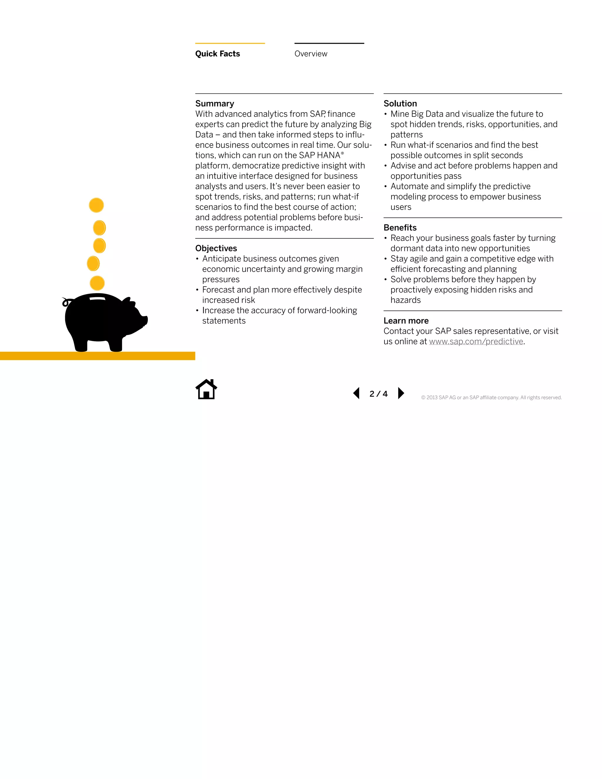 The document outlines SAP's advanced analytics solutions designed to help businesses predict outcomes by analyzing big data. It emphasizes features like an intuitive interface for business users, automation of predictive modeling, and methods for identifying trends and risks. Additionally, it discusses use cases for integrating predictive analytics into finance processes to improve decision-making and operational efficiency.