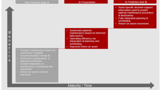 The document discusses the evolution of maintenance strategies from reactive to predictive maintenance, highlighting the benefits of condition-based maintenance (CBM) for optimizing engine reliability and performance. CBM leverages real-time data monitoring and analysis to schedule maintenance based on actual asset conditions, reducing costs and unscheduled downtime. It underscores the importance of data acquisition, processing, and decision-making in establishing effective CBM practices, while also noting the challenges associated with implementation.