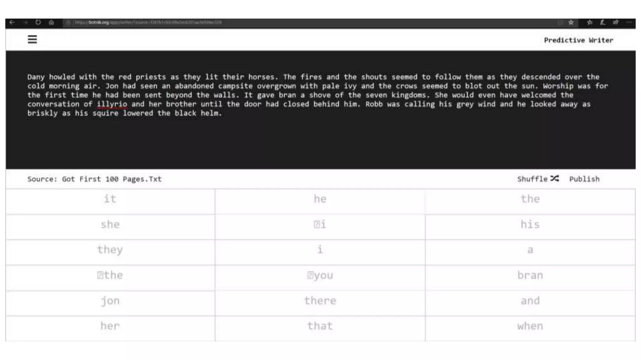 This document discusses the use of predictive text in writing through the Botnik app, which allows users to combine various source texts to create unique narratives. It provides guidance on how to upload custom sources, find public domain texts, and participate in writing challenges, such as crafting scenes or poems. Additionally, it includes instructions on sharing creations and notes on copyright considerations.
