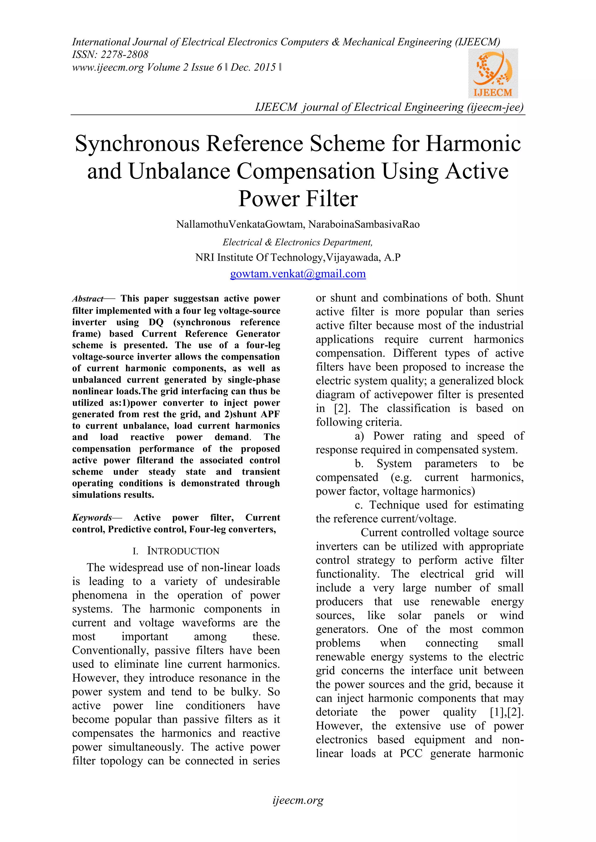 1) The document describes a synchronous reference frame (DQ) based current control scheme for a four-leg voltage source inverter active power filter to compensate for current harmonics and unbalances from nonlinear loads.