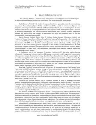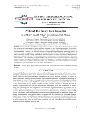 The document discusses the development of 'PredictXI', a machine learning-based system designed to enhance fantasy team selection for sports prediction platforms like Dream11 and Vision11. It analyzes critical variables affecting player performance and team success to help users create optimized fantasy teams, ultimately increasing their chances of winning. The system's capabilities are supported by a literature review covering various machine learning techniques applied in fantasy sports prediction.