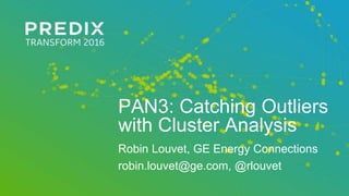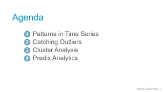 The document discusses using cluster analysis to identify outliers in time series data. Cluster analysis involves grouping similar data points together. It can be used to spot abnormal patterns and outliers in industrial time series data, which is important for tasks like fraud detection, asset health monitoring, and detecting non-technical losses in networks. The presentation provides an example of using Predix Analytics on a non-technical loss detection project, where cluster analysis was used to identify outlier data in time series signals from networks.