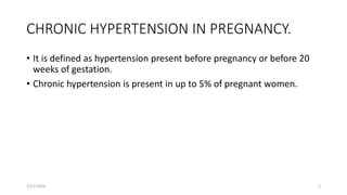 The document discusses chronic hypertension in pregnancy and pre-eclampsia. It defines chronic hypertension as hypertension present before 20 weeks of gestation. Risk factors for chronic hypertension include age over 40, duration of hypertension over 15 years, high blood pressure levels, and medical disorders. Effects on the pregnancy include superimposed pre-eclampsia, IUGR, and stillbirth. Prenatal care includes tests to rule out other conditions and monitor the pregnancy. Pre-eclampsia is characterized by new hypertension and proteinuria after 20 weeks of gestation in a previously normotensive woman. It can lead to maternal and fetal complications if not monitored and managed properly. Management involves hospitalization, medication, and delivery depending on severity and