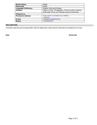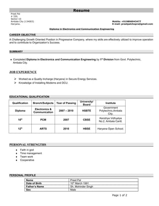 Preet Pal has a diploma in electronics and communication engineering from Government Polytechnic in Ambala City. He worked as a quality incharge for Secure Energy Services where he installed modems and DCUs. Preet Pal completed 10th grade from Kendriya Vidhyalya No.2 in Ambala Cantt and 12th grade from Haryana Open School. He has strengths in time management, teamwork, and being cooperative.