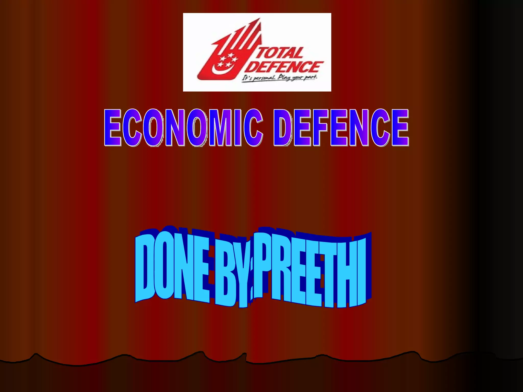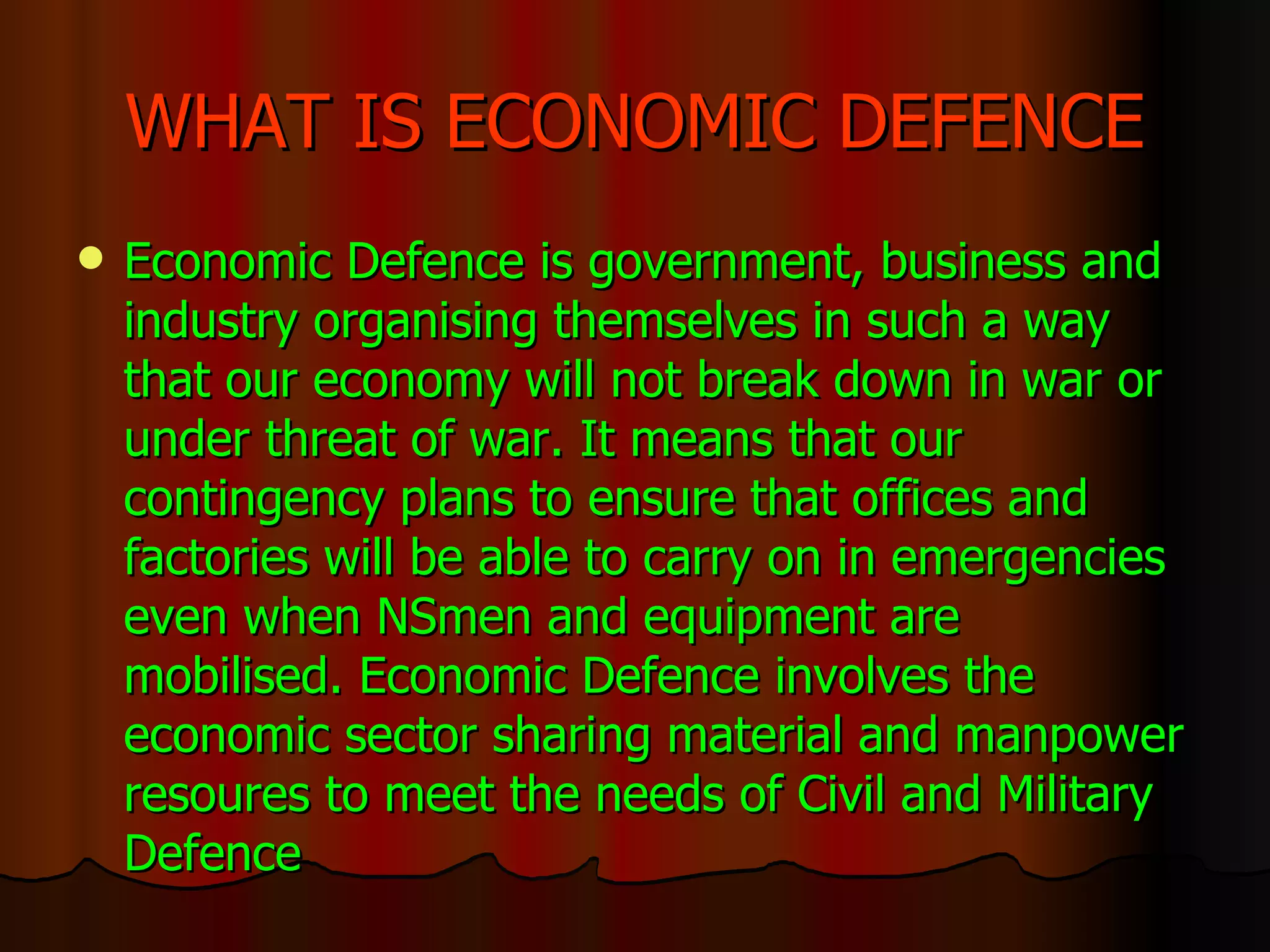 Economic Defence involves government, businesses, and industry organizing themselves so the economy can continue operating during war or threats of war. It means having contingency plans so offices and factories can still function even when resources are mobilized for civil and military defence. Economic Defence also means sharing material and manpower resources between the economic sector and civil and military defence to meet both their needs.