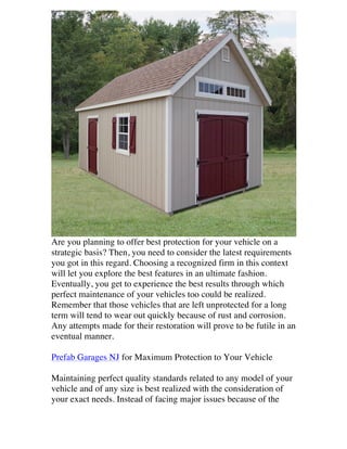 The document discusses the benefits of prefabricated garages from NJ suppliers to protect vehicles. Purchasing a prefab garage allows maximizing storage space, offering protection from weather, and maintaining the vehicle's quality over the long run. Customers can choose from customizable options and specialized features within their budget. Prefab garages are a worthy investment that have provided lasting quality and satisfaction to many existing customers.