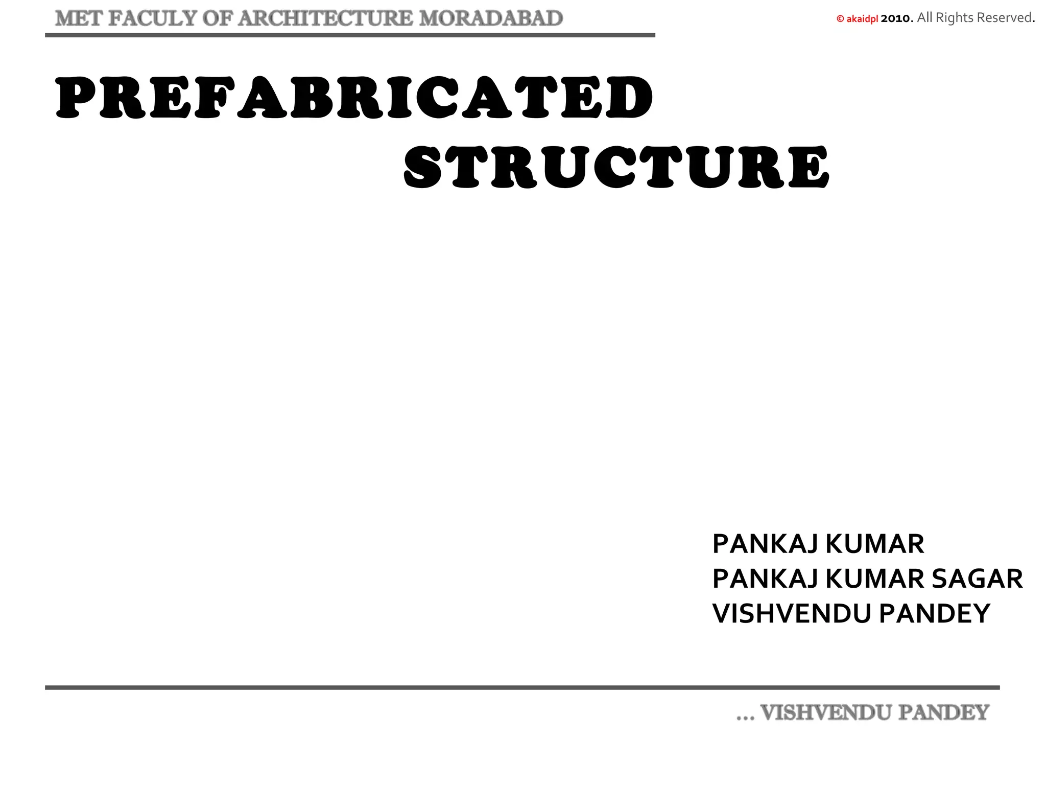 The document discusses prefabricated structures and their advantages over traditional construction methods. It notes that prefabricated structures can be built faster, with higher quality, improved safety, and lower costs compared to traditional methods. However, it also outlines some common problems with relocatable prefabricated structures, such as issues with indoor environment quality, flooring, and appearance. The document advocates for future prefabricated structures that can accommodate different climates, architectural styles, and contexts while addressing these common problems.