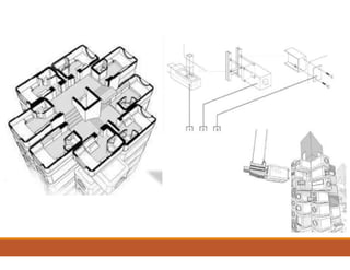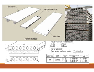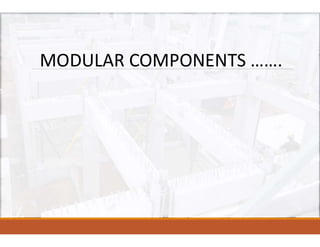 This document discusses modular and prefabricated construction components used in precast concrete buildings. It describes the key components that can be prefabricated off-site such as walls, floors, beams, columns, stairs, and their connections. These include different types of precast walls, slabs, beams shaped as I-beams, L-beams or rectangular, and dimensions for efficient construction. Connection details are provided for beam-column, wall-foundation, and other joints.