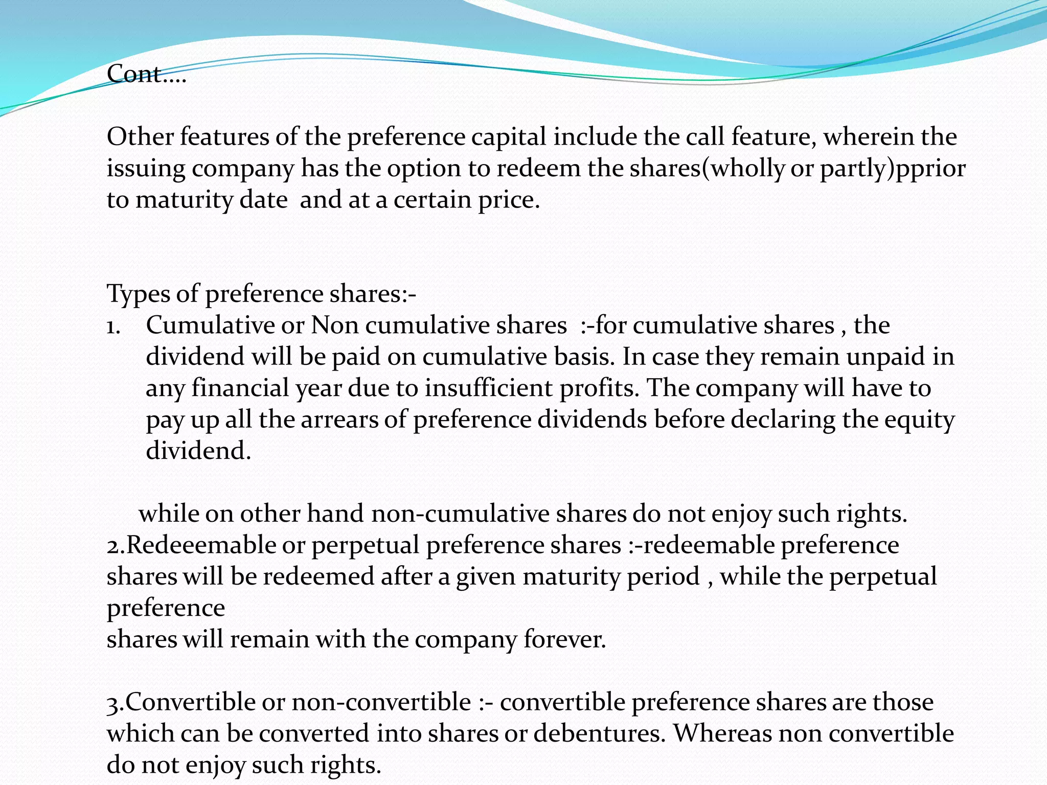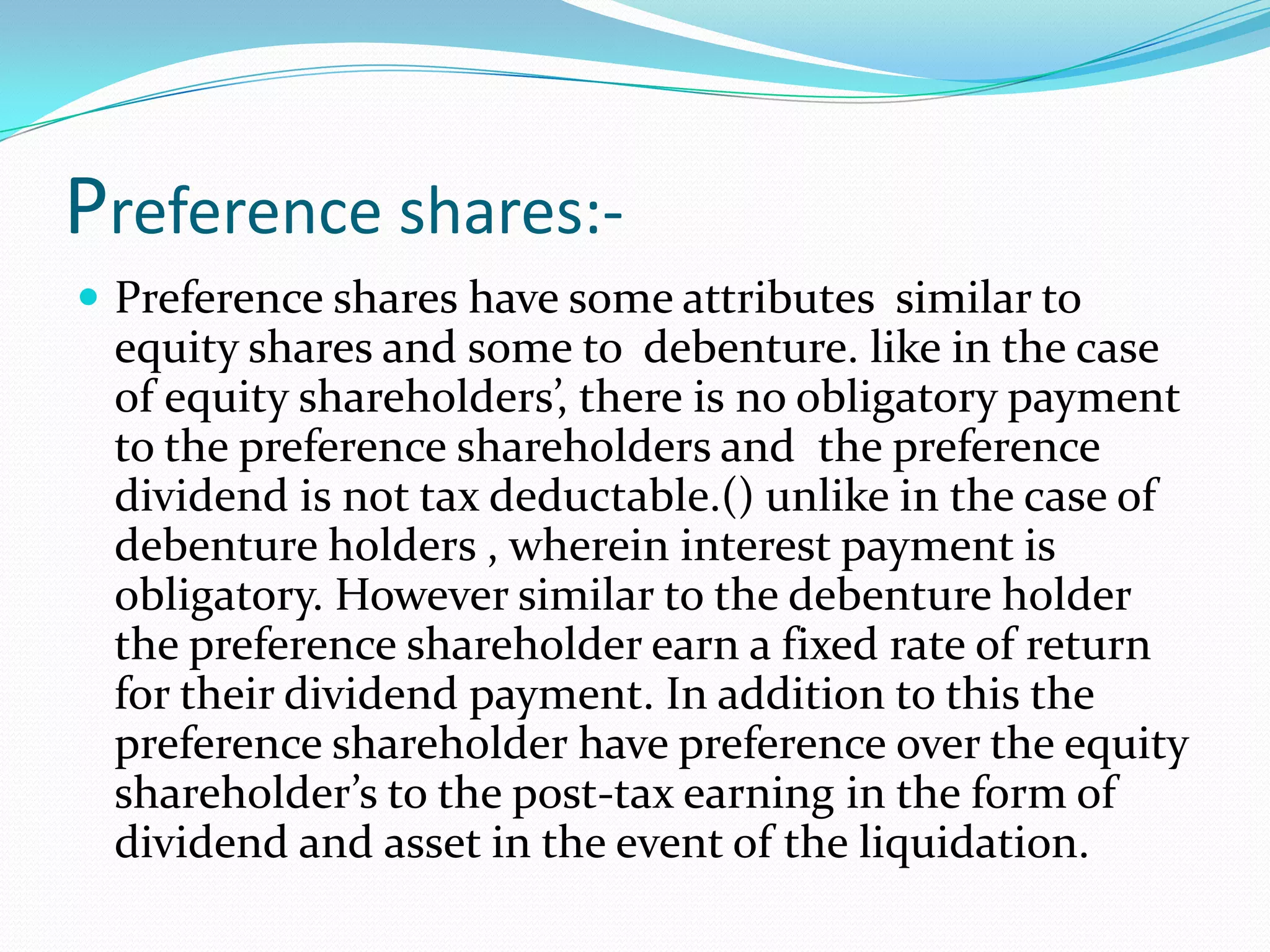 Preference shares have characteristics of both equity shares and debentures. Like equity, there are no obligatory dividend payments but dividends are not tax deductible. Like debentures, dividends provide a fixed rate of return but preference shareholders have priority over equity shareholders for dividends and assets in liquidation. Preference shares can also be redeemed or perpetual, cumulative or non-cumulative, and convertible or non-convertible. Voting rights for preference shares are now restricted except if dividend arrears exceed two years.