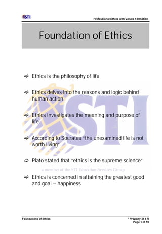 Ethics is the study of human behavior and morality. It investigates concepts like right and wrong, and seeks to understand the meaning and purpose of human life. Ethics has foundations and premises like other sciences, such as the existence of moral differences between actions. It also considers challenges from schools of thought like moral skepticism and relativism. Overall, ethics examines how humans ought to behave and is concerned with attaining the greatest good of happiness.