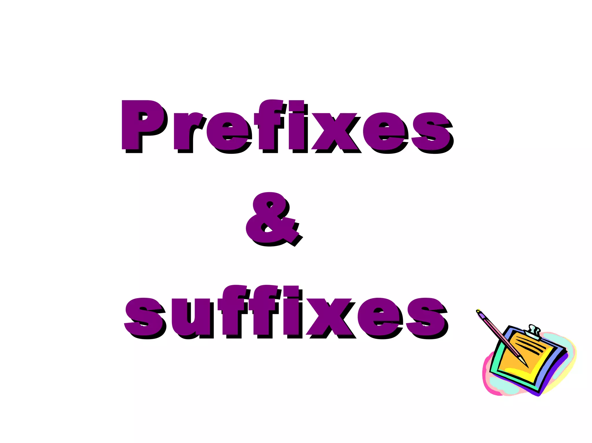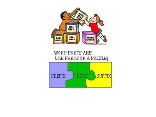 The document discusses prefixes and suffixes, which are word parts that can be added to the beginning or end of root words to change their meaning. It provides examples of common prefixes like "sub", "inter", "multi", and "ultra" and common suffixes like "-ment", "-tion", "-ous". It then gives 50 examples of words formed by combining roots with prefixes or suffixes and explains the meaning of the new words.