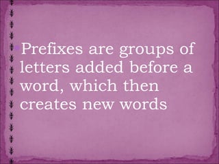 This document discusses prefixes and their meanings. It provides examples of common English prefixes like "bi" meaning twice, "dis" meaning not, and "sub" meaning under. It notes that prefixes can add or change the meaning of words. The document encourages learning prefixes to improve vocabulary and comprehension of new words, though memorization is required. It then provides a lengthy list of prefixes and example words to illustrate their meanings.