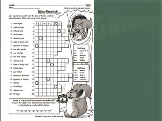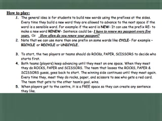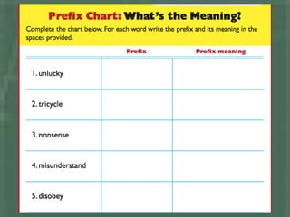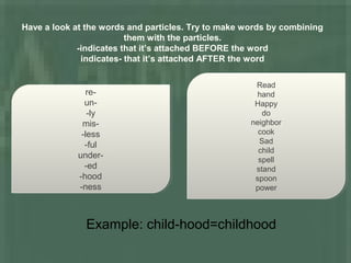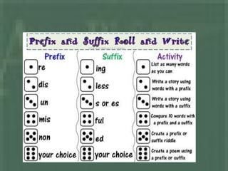 This document discusses word parts such as prefixes, suffixes, and root words. It provides examples of common prefixes like "re-", "un-", and "mis-" and their meanings. Suffixes like "-ly", "-ness", and "-ful" are also explained. Students are instructed to identify prefixes, suffixes, and root words in words and divide words like "uncooked". Videos are shared that teach about prefixes and suffixes through songs. Students will then work in groups to create prefix, root word, and suffix cards for 12 words and try to recombine the words.