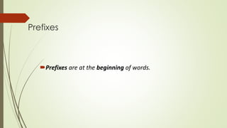 The document discusses prefixes and suffixes. It provides examples of common prefixes used to indicate time, place, size, direction, and number. It also gives examples of common suffixes used to form nouns, adjectives, adverbs, and verbs. Suffixes are divided into derivational suffixes, which change a word's part of speech or meaning, and inflectional suffixes, which create different forms of the same word. Inflectional suffixes for nouns, verbs, and adjectives are outlined.