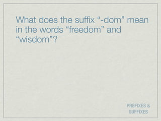 The document is a quiz about prefixes and suffixes. It contains 20 multiple choice questions about the meanings of prefixes like "tri-", "dis-", "pre-", and suffixes like "-dom", "-ness", "-ous". The questions ask the learner to identify the meanings of prefixes and suffixes in given words and sentences.