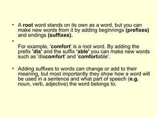 The document discusses prefixes and suffixes, providing examples of how adding prefixes and suffixes to root words can create new words and change or add to the words' meanings. It notes that suffixes often indicate a word's part of speech and how it will be used in a sentence. Some suffixes can cause spelling changes in the root word.