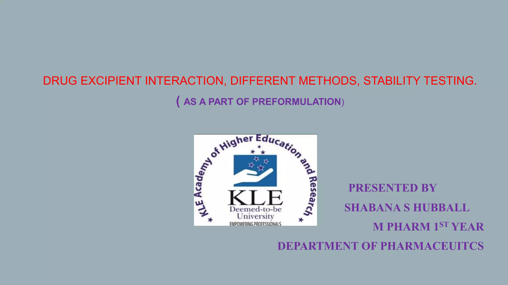 The document discusses the significance of drug-excipient interactions in pharmaceutical formulation, highlighting their potential beneficial or detrimental effects on drug stability, therapeutic activity, and overall product efficacy. It details various mechanisms of interactions, the importance of compatibility studies, and different methodologies for assessing drug-excipient interactions, including physical, chemical, and physiological interactions. Additionally, it emphasizes the necessity of stability testing to evaluate the quality and longevity of drug products under varying environmental conditions.