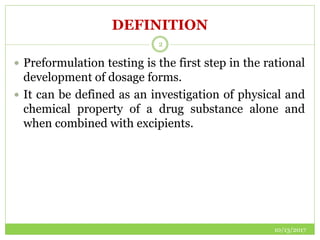 This document discusses pre-formulation studies, which involve investigating the physical and chemical properties of drug substances alone and when combined with excipients. Some key areas covered include polymorphism, hygroscopicity, particle size characterization, and solubility analysis. Thermal analysis techniques like DSC and XRD are described as useful for characterizing polymorphs. The importance of solubility studies at various pH levels and temperatures is highlighted for developing oral dosage forms with appropriate dissolution profiles.