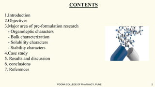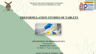 The document outlines preformulation studies of tablets focused on the physicochemical properties of drug candidates, particularly cannabidiol (CBD), to enhance the development of stable and bioavailable dosage forms. It discusses key areas such as organoleptic properties, bulk characterization, solubility, and stability analysis to guide the selection of excipients for developing orodispersible tablets. A case study demonstrates methodology and results, emphasizing the compatibility of CBD with various excipients and the effectiveness of using specific formulations for improved disintegration and performance.