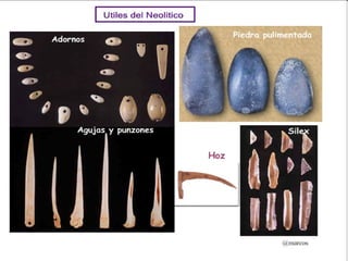 3:Descubriments. · Paleolíticsuperior : -El respat dels osos amb pedra els va permetre crear nous estris (hams i arpons) -L’arc i la fletxa. -Els seus vestits eren fabricats amb la pell i cuir, cosits gràcies a la fabricació d’agulles d’os. · Neolític: -La roda. · Edat dels metalls : -Rudiments de la navegació a vela i van perfeccionar la utilització del transport de rodes.
