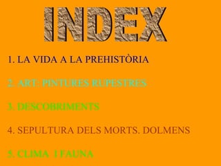 1. LA VIDAA LA PREHISTÒRIA 2. ART: PINTURES RUPESTRES 3. DESCOBRIMENTS 4. SEPULTURA DELS MORTS. DOLMENS 5. CLIMA I FAUNA INDEX