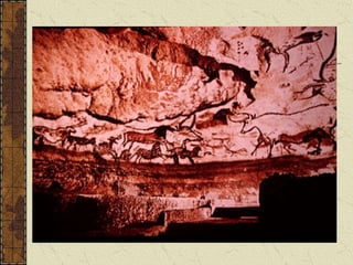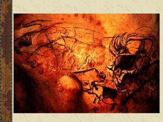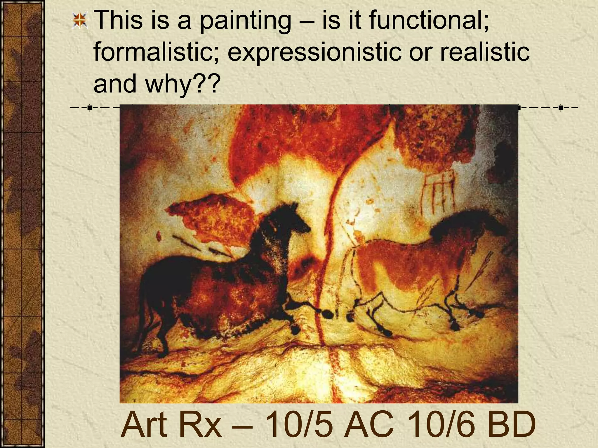 This document provides information about prehistoric art from 25,000 to 2500 BCE. It discusses that prehistoric art was made for practical purposes like helping with hunts or pleasing natural forces. Examples of prehistoric art forms discussed include bone and stone figurines, massive stone structures like Stonehenge used as astronomical calendars, and cave paintings using charcoal and pigments. Cave paintings often depicted animals to guarantee successful hunts. Characteristics of prehistoric "cave art style" included sketchy lines, crude details, and earth tone colors with dark outlines. The document provides examples for students to draw prehistoric art in the cave art style.