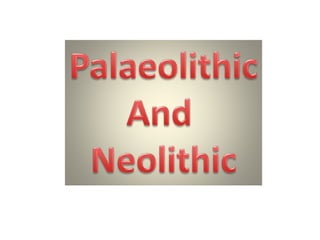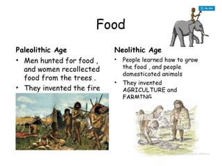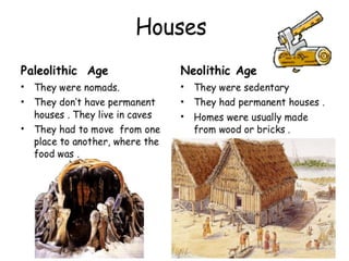 People were nomadic during the Paleolithic period, living in caves and hunting for food. During the Neolithic period, people became sedentary, living in houses and practicing agriculture and farming. The Neolithic period saw the development of agriculture and domestication of plants and animals. Nomadic people traveled between locations in search of food. Fire was invented during the Paleolithic period.