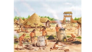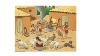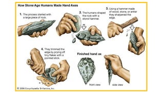 This document summarizes human prehistory from the Paleolithic era to the Metal Ages. It describes how early humans lived as nomadic hunter-gatherers during the Paleolithic era, making tools from stone, bone, and wood. During the Neolithic era, humans transitioned to a more sedentary agricultural lifestyle, domesticating plants and animals and developing pottery and weaving. Finally, the Metal Ages saw the discovery and increasing use of metals like copper, bronze and iron for tools and weapons, as well as the emergence of specialized jobs like metalworkers and traders.