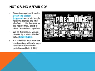 The document discusses prejudice and where it comes from. It explains that prejudice is judging someone without knowing anything about them, which can be influenced by family, friends, and media. Prejudice often comes from fears of those different in the past but now that people travel more we should respect differences. Religious prejudice still causes conflicts today. The document encourages recognizing prejudice in broad generalizations and considering how one would feel if treated unfairly for something they cannot control like race or religion.